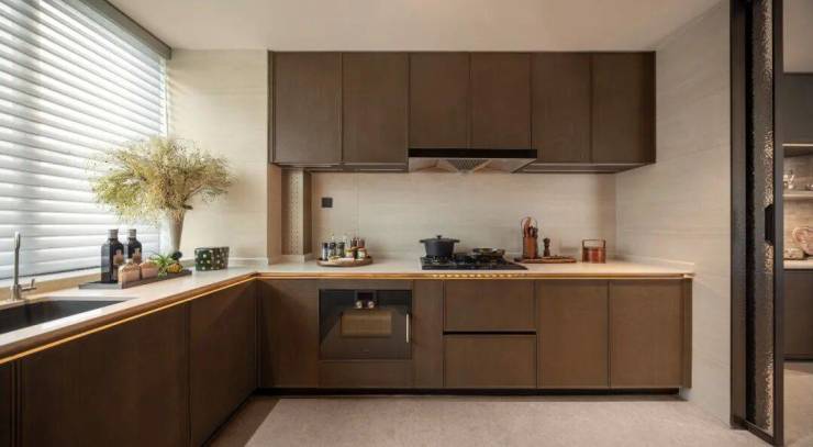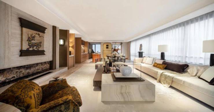 室内大面积的采用洞石、冰白玉、镜湖春晓等稀有奢石,厨房直接上了住宅顶配的嘉格纳三件套,以及AEG冰箱、AEG吸油烟机、通用末端超滤、摩恩食用垃圾处理器 、欧普凉霸……全是顶配。