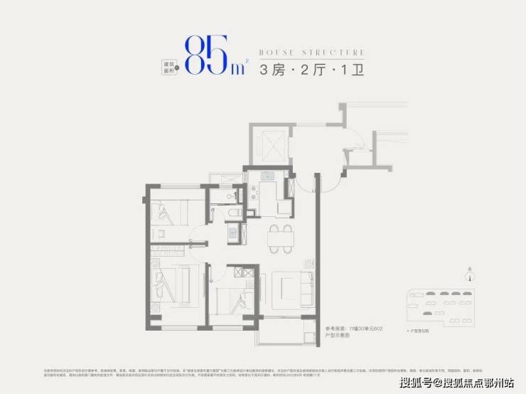 建面约85㎡3房1卫,做到 三开间朝南+全卧室带飘窗+卫生间干湿分离 +动静分离,非常紧凑的小3房。