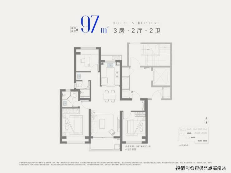 建面约97㎡3房2卫, 升级版大3房,入户玄关+主卧套房设计 ,整体私密性更强,空间更为宽敞。