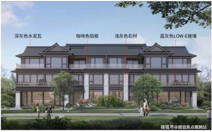 效果图上来看,外立面为新中式风格,由深灰色水泥瓦、咖啡色铝板、浅灰色石材、蓝灰色LOW-E玻璃组合而成。