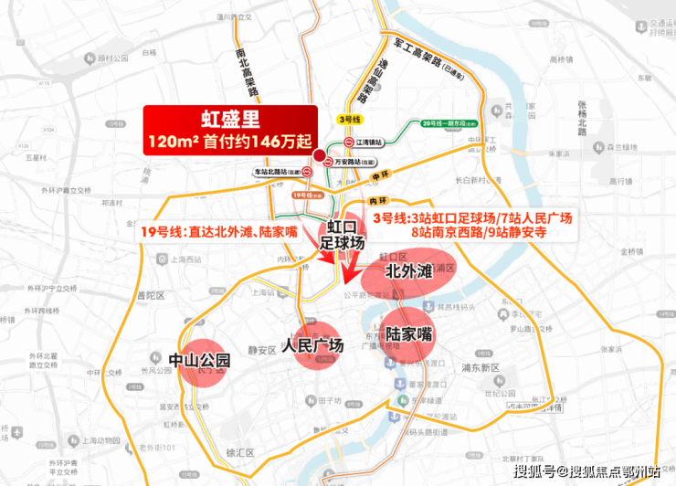 三轨交环绕形成高效通勤网—— 直线距离3号线江湾镇站约500米,3站虹口足球场/7站人民广场/8站南京西路/9站静安寺; 直线距离20号线万安路站约150米(在建)/直线距离南北大动脉19号线车站南路站约900米(在建),未来可直达北外滩、陆家嘴。