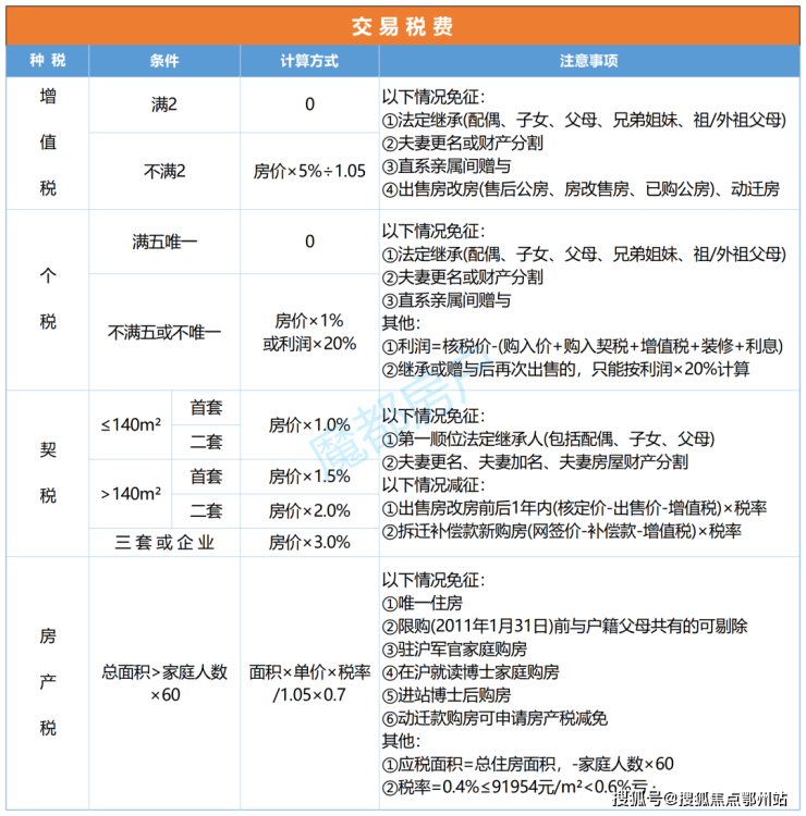 1、增值税:持有住房满2年,增值税为0;否则,增值税=房屋交易价格x5.05%;