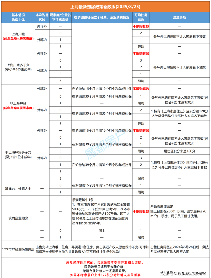 由于上海购房相关政策调整的频率较快。为了让大家更全面、更直接地了解上海楼市新政后的变化和买房知识,整理出了截止2025年8月25日上海最新购房政策知识,含最新的限购限售、购房税费、房贷利率、上海落户,购房补贴等等政策内容, 信息量巨大,建议分享收藏后期查阅。