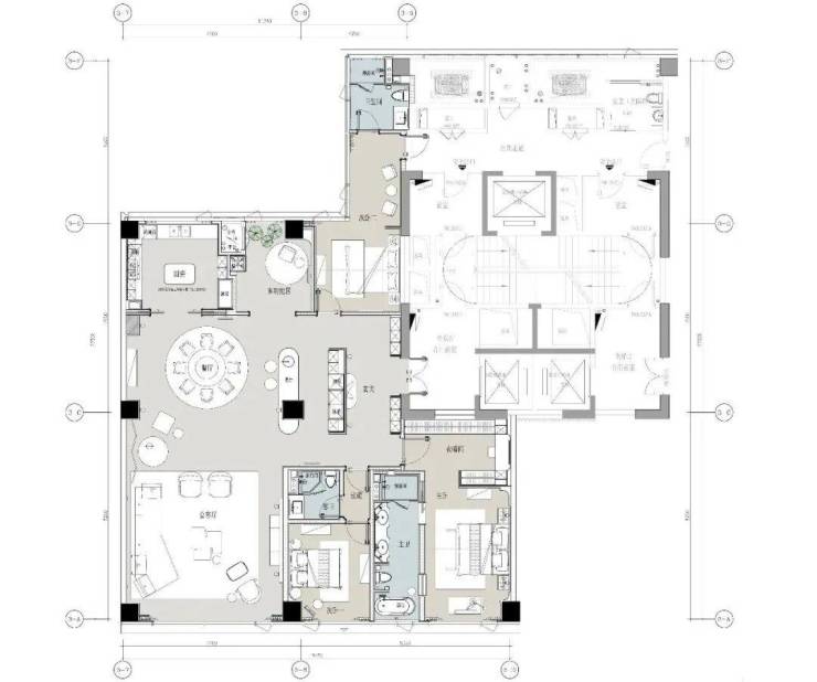 中间套的客餐厅更是达到约100㎡,一张12人的大圆桌也有充足的空间优雅转身。周末约上好友来聚会,给主人赚够了颜面。