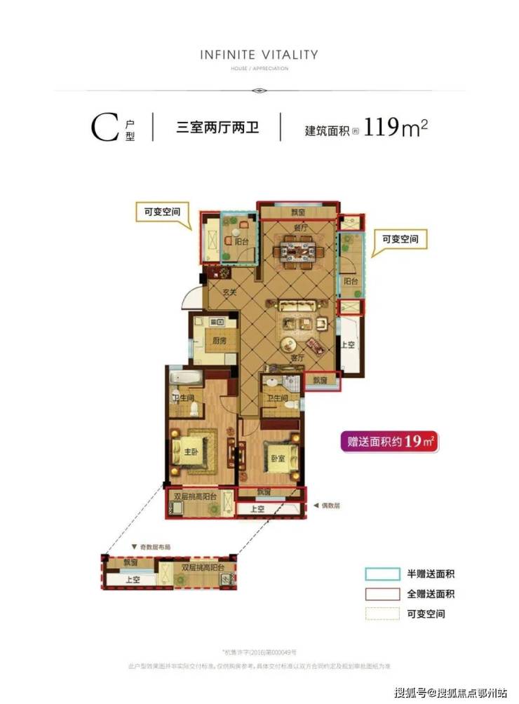 【119方】当然,也有供刚需购房者“一步到位”的三房户型——119㎡,其中可变空间也有约19㎡。