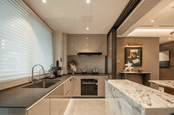 160㎡户型非常有特点,采用了当下最流行的广角边厅设计,不仅南北通透,更有三面采光。超7米长飘窗+270°环幕式全视野景观阳台,做出了大平层的尺度感。