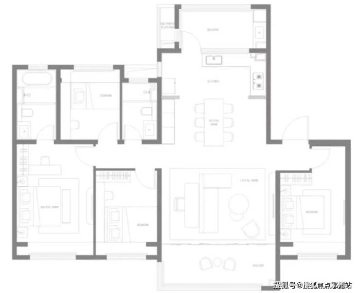 142㎡户型采用了LDKB一体化布局,经典的四叶草户型,小横厅户型,阳台约5.2米,缺点是南北进深较大,餐厅采光有影响。