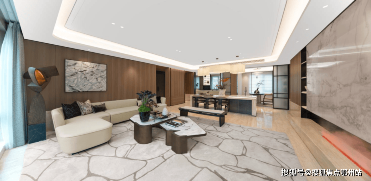「缦云225」央景楼座, 采用LDK一体化大方厅,客厅、餐厅、中西厨房3大空间全部打通,在功能独立的前提下又能自成一体,形成洄游式生活动线。