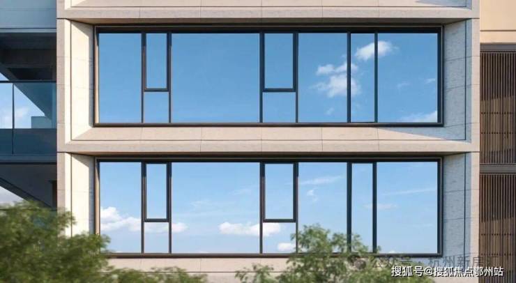历久弥新的经典形制丨高层:底层以沉香米黄石材多重叠加,主体大面三玻两腔玻璃幕墙+仿石铝板斜切面搭配古铜色铝板内侧镶边打造大尺度油画框般经典华丽的立面,北侧搭配深灰色格栅强化立面对比效果;▲元起观潮效果图