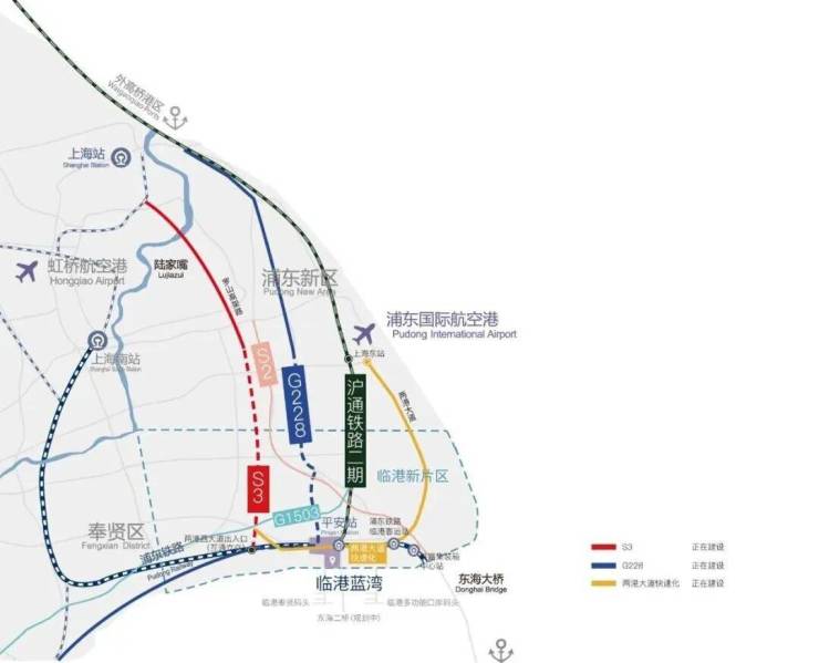 沪苏通铁路(在建)、沪乍杭铁路(规划)和沪舟甬铁路(规划)3条国铁建设,串联浦东机场对外窗口;
