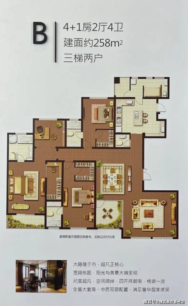 项目以大户型平层4房5房为主,配以部分顶层复式,户型空间阔绰,布局灵活合理,(建筑面积从190-260平米,复式建筑面积360-350平米)。