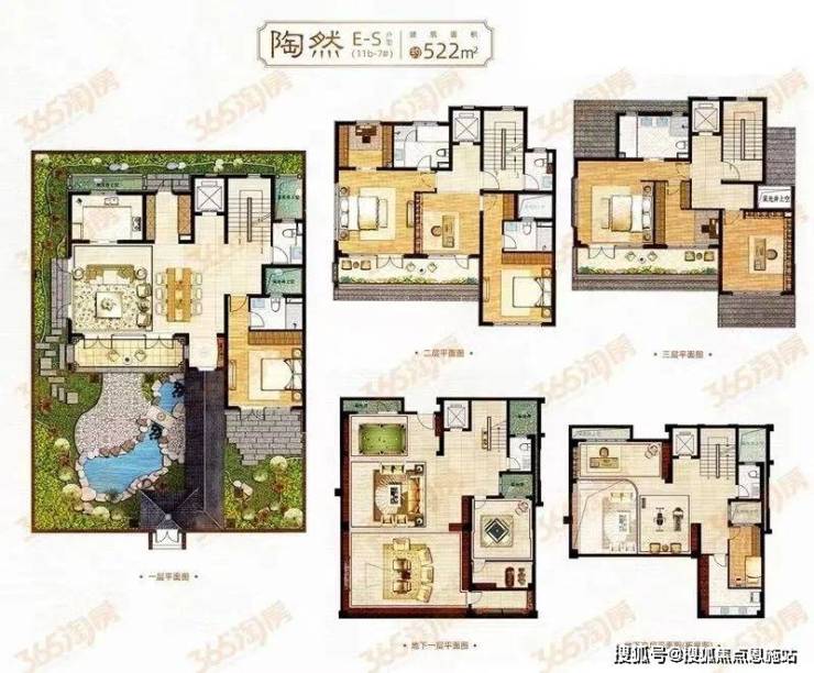 项目共有5种户型,建面约240、约300、约373、475、522㎡,