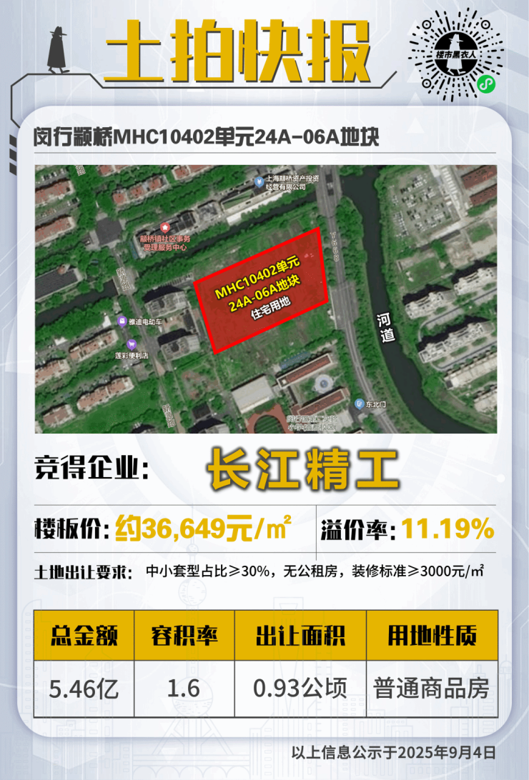 2025年上海七批次土拍中,来自浙江的民企长江精工,以54648万的总价,拿下了闵行颛桥MHC10402单元24A-06A地块;成交楼板价36649元/m²,溢价率11.19%,装标不低于3000元/㎡。