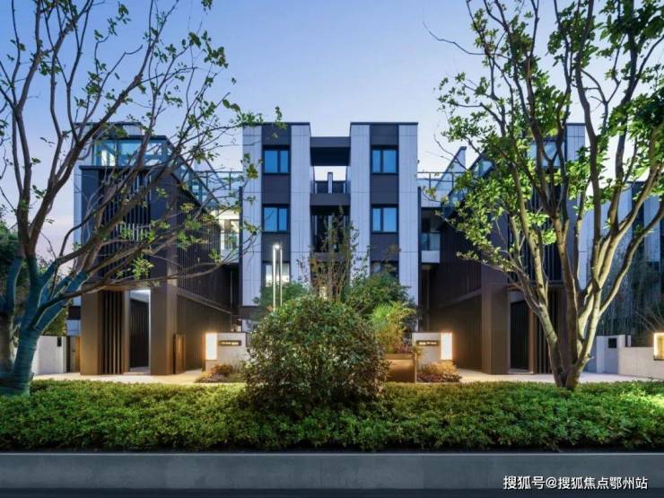 项目联排外立面采用 素白色花岗岩石材,点缀建筑的造型线脚选用挺拔的深咖色铝板,整体风格营造一种江南特有的水墨意境。
