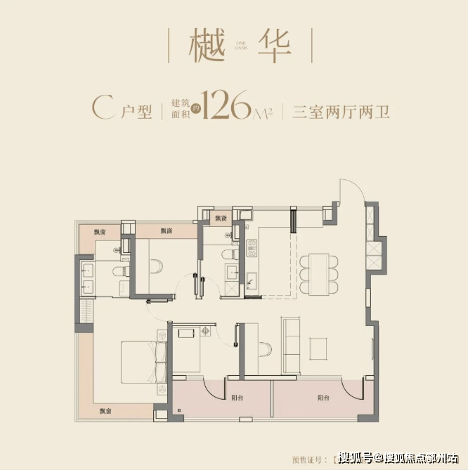 建面约126㎡ 三房两厅两卫(舒适改善款):品质刚需进阶之选,总价760-780万,单价60800-62400元/㎡。南北通透格局,空间尺度升级;客餐厅一体化设计,衔接宽景阳台,拓展活动空间;主卧配备270°转角飘窗,采光绝佳且视野开阔,独立卫浴+衣帽间设计提升居住舒适度;细节处预留充足收纳空间,适合对居住品质有更高要求的刚需家庭,兼顾通勤便捷与生活质感。
