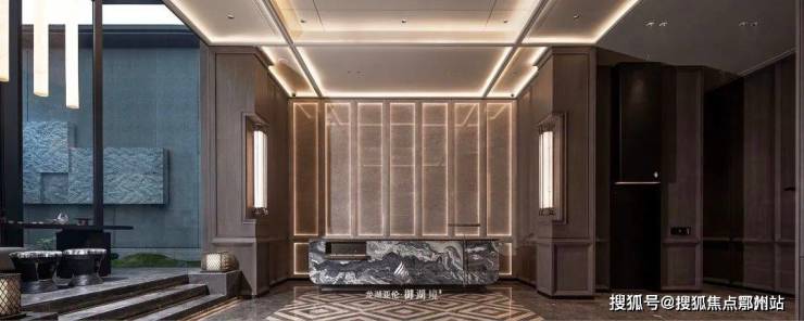 以杭州国家版本馆为灵感,融合 8面紫山水奢石屏扇,打造的地标级豪宅门庭,一眼望过去,气势夺人。