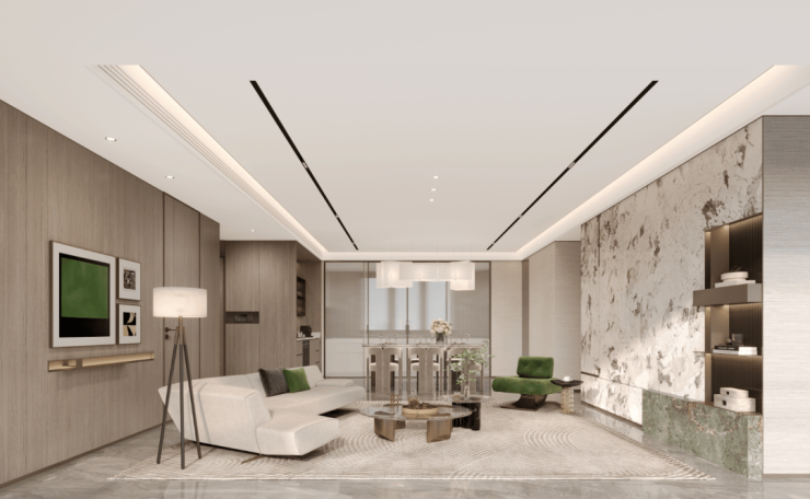 明耀府的外立面,采用底部石材干挂+上部大面积中空玻璃+金属线条的结合方式。不仅现代简约、历久弥新,更以高窗墙比确保室内的采光和视野,质感高级。