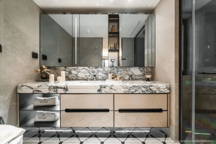 在豪宅的配置之外,精装细节亦追求极致:公共区域选用80×80cm的大理石通铺,以整面石材的厚重质感彰显空间格调,同时采用无缝拼接工艺,显著降低了日常清洁的难度。