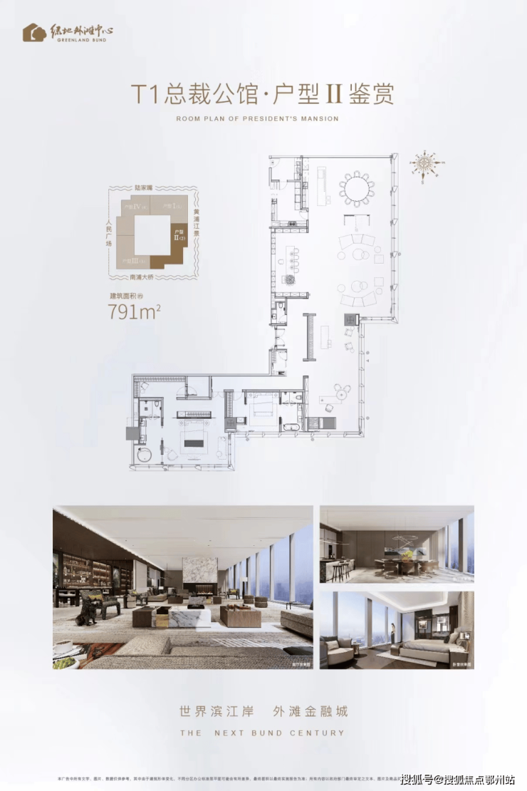 外滩·天幕1715,位于外滩地标绿地外滩中心T1#300m超高层楼栋,标准层高约4.5m,主力户型面积约724-799㎡,