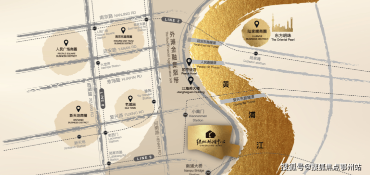 北外滩;西视角:人民广场、新天地;东视角:浦东、黄浦江;南视角:南浦大桥、世博园。