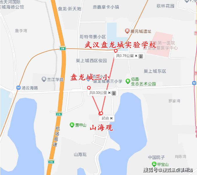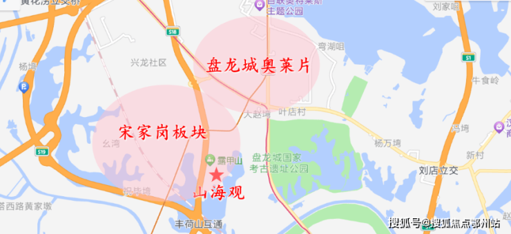 山海观位于汤云海路以南,机场高速以东,紧挨露甲山和汤仁海路,楼市中既属于盘龙城奥莱片,又靠近宋家岗板块,行政划分属于黄陂区。