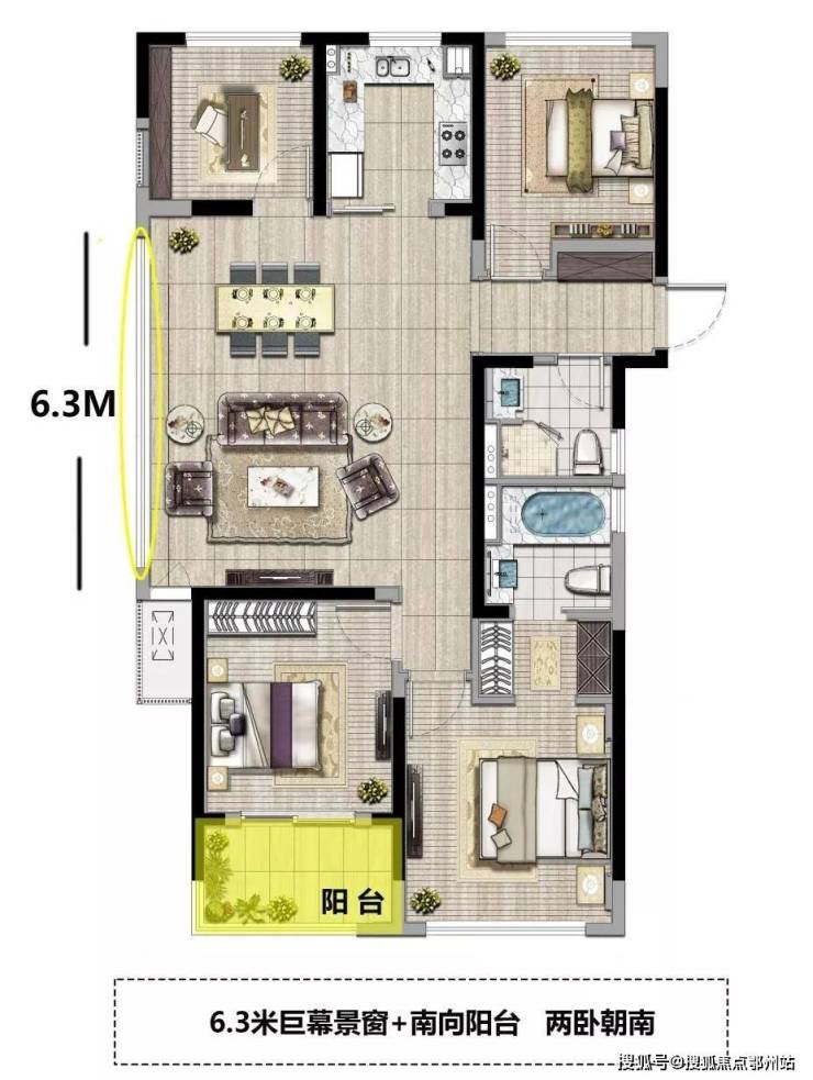 同时,客厅配置约6.3米的巨幕景窗,采光、通风、纳景,与室外景色融为一体; 大幅提升了视野通透性、居住沉浸感。主次卧朝南,次卧连接南向景观阳台,不仅饱览社区美景,空间运用更为自由,品质生活悠然自得。