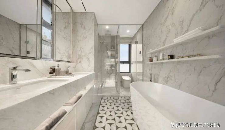 此外,室内还大量运用 雅士白大理石、大花白岩板、皇家孔雀岩板、水纹夹丝玻璃、仿洞石岩板、卡拉卡塔白岩板、灰色皮革 等定制材质,以华润置地独有的“五奢体系”,彰显着对高品质生活的极致追求