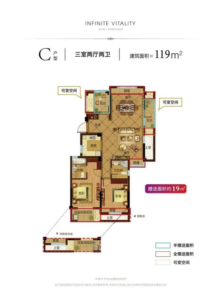 ▫️119㎡三房:约19㎡可变空间,适合一步到位的刚改家庭