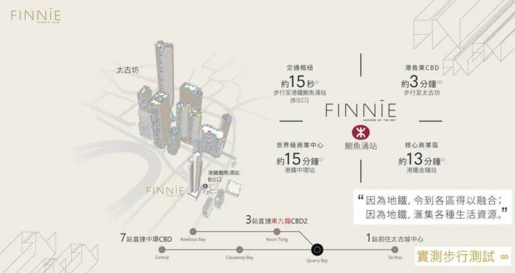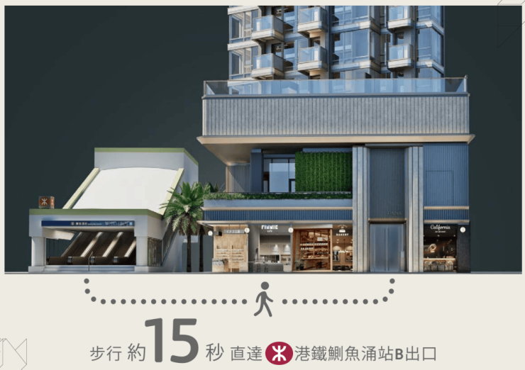 是的,你没有看错标题,在港岛现在还有下楼15秒就能抵达地铁口的新盘,这就是位于鰂鱼涌地铁站B出口的:FINNIE