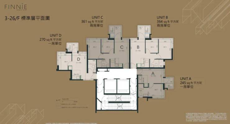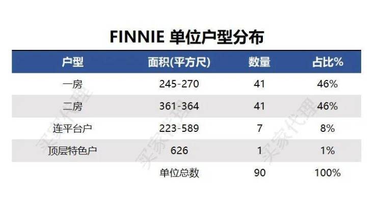 FINNIE属单幢式设计,合共提供90伙分层住宅,项目单位实用面积介乎223至626尺, 户型涵盖一至三房,单位供应以1房及2房戶为主, 合占供应量九成以上。