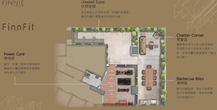 项目设有264尺住客会所「FinnFit」,由设计公司VIA负责设计,分为「Power Core」休闲空间、「Unwind Zone」健身区,「Chatter Corner」聚会区及「Barbecue Bliss」烧烤区四大区域, 为住户提供各式休闲活动设施,另设有757尺园景区或绿化地带。