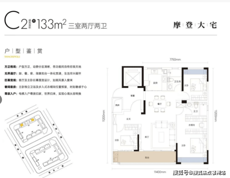 专梯专户布局,私密性更高,整个户型十分的方正,南向大面宽阳台,主卧以及北向次卧均带大尺度飘窗,有一定的拓展面积;三个房间有所隔开,各自的私密性更好。