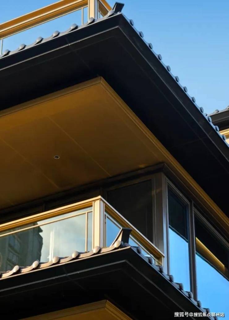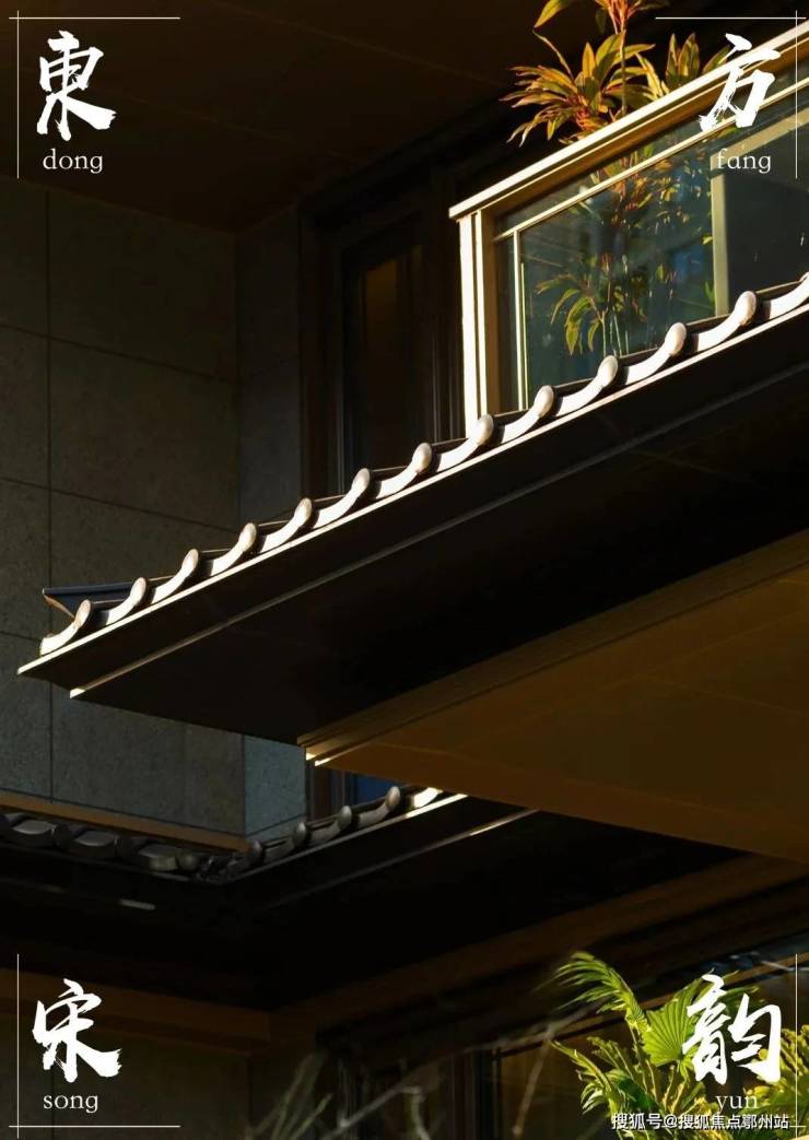 三重屋檐,代表天地人融合的东方宫殿最高等级,上檐、外檐、下檐三重结构,现代立面,以铝板、格栅、石材、瓦墙型材、玻璃等现代型材,彰显传世之宅的独特气度。摒弃早期中式建筑的白墙黑瓦,精研居住建筑的材质与色彩搭配,注重冷暖的多重对比。中式建筑的立面呈现出的不是粉墙黛瓦,而是「宋韵五色」。