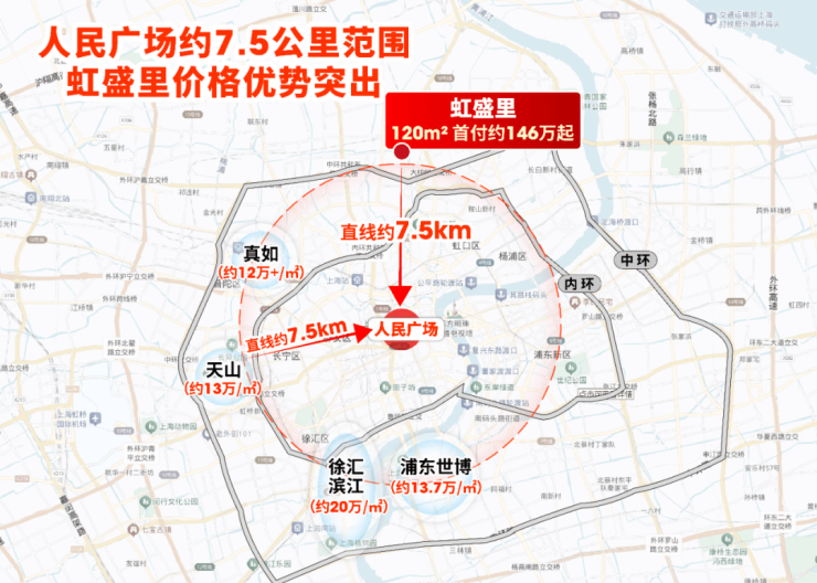 项目直线距离人民广场仅约7.5公里,在真如、徐汇滨江、天山、世博等同等区位板块中,是价格更划算的新房选择。