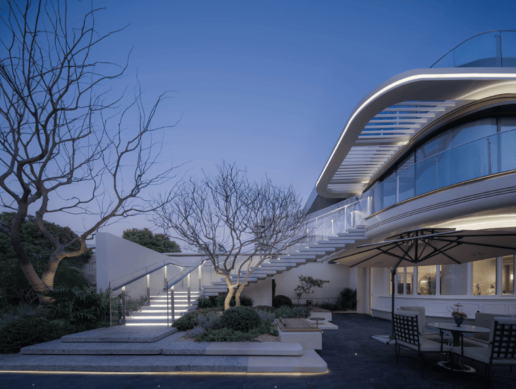 西侧主归家动线中的“纳西索斯之镜”超薄镜面水景,既提升了仪式感,又巧妙解决了消防登高面的景观化处理难题,体现了极致空间利用的智慧。