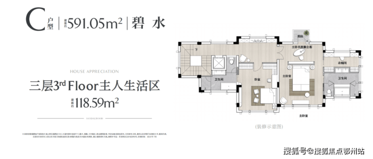 三楼是对标高端度假酒店的总统套房设计,将舒适发挥到了极致,卧室、衣帽间、书房、收藏室、温泉泡澡式卫生间和休闲阳台一应俱全。这里可以是业主「私人第二客厅」,体验一种把超大地上花园搬到了空中的顶豪墅级生活。