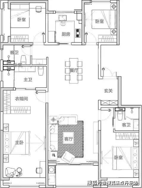 E户型 建面约168㎡4房边套
