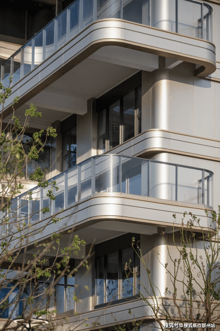 藏湖特意设计的 外立面流线型美学,超80%都是玻璃幕墙、金属板材、石材 ,弧形转角玻璃与香槟金几何造型,通透灵动,一眼封神。