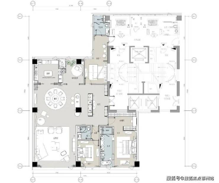 中间套的客餐厅更是达到约100㎡ ,一张12人的大圆桌也有充足的空间优雅转身。周末约上好友来聚会,给主人赚够了颜面。