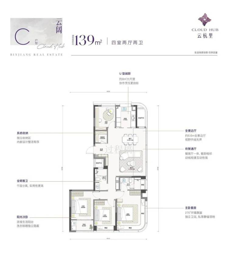 建面约139方4房2厅2卫边套 ,实得率约91%,布局“优秀”。全封闭式阳台,三面采光,观景视野无敌。