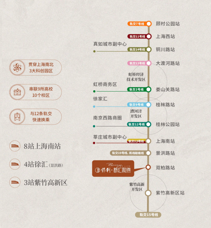 15号线双柏路站距项目直线距离约650米(数据来源于百度地图测绘),约20公里万亿产业带,贯穿上海南北3大科创园区,串联9所高校10个校区,与11条轨交快速换乘。