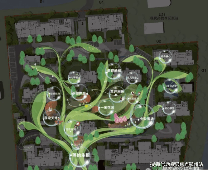 社区园林以主入口为根基,生长出枝叶错落的“4境16景”