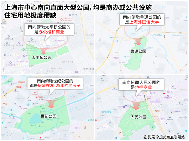 具体到上海,你会发现市区南向俯瞰大型优质公园的房子,有也只是20年以前的老房子。