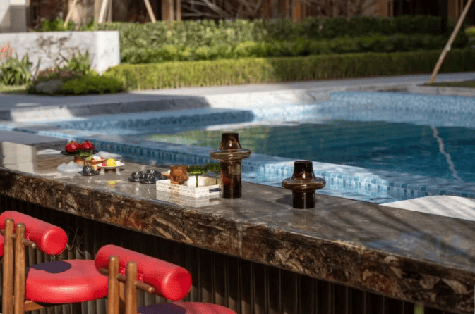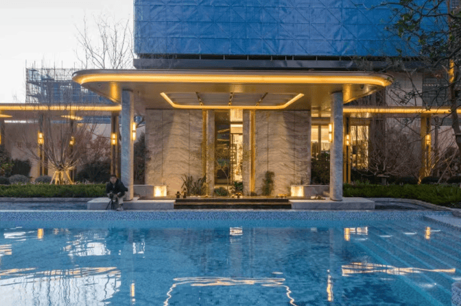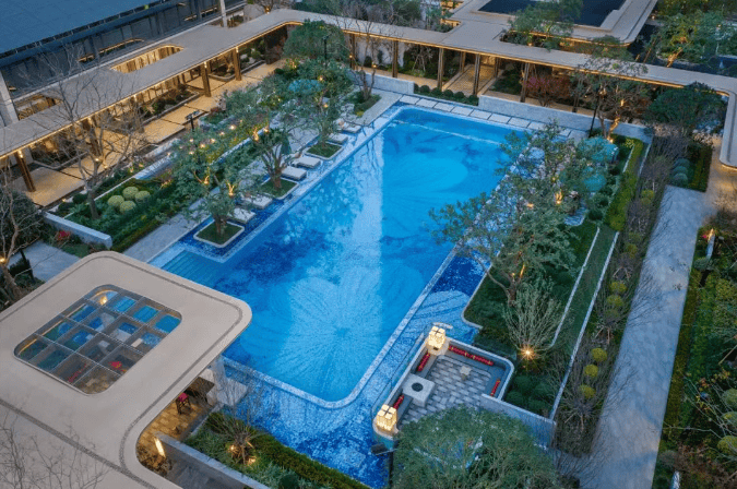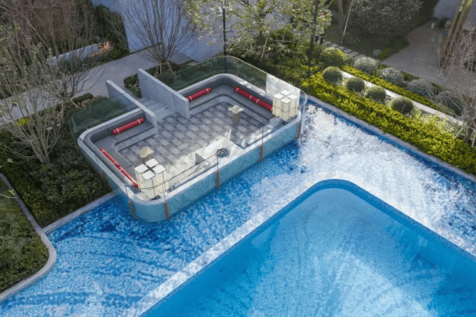 泳池深水区30*11m,池底图案为拼花马赛克的海棠花,与“知海棠”知性艺文气质相呼应,泳池四周为浅水区,廊架、坐凳、入户景墙、种植池等均使用威斯康白花岗岩,质感材质肌理,点缀惬意度假氛围,四周风雨连廊串联起观景、漫步、休憩与社交,形成泳池的复合型功能。