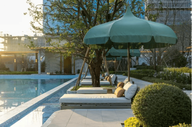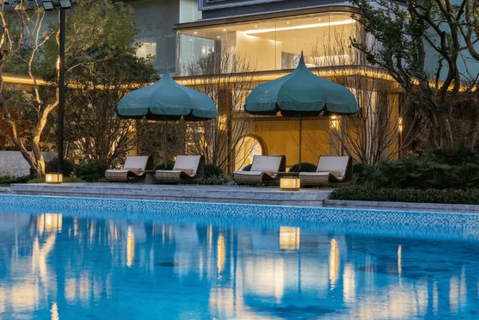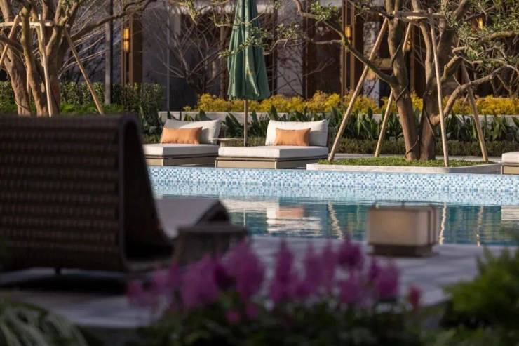 泳池整体采用巧妙的无界设计,水体边缘视觉消隐,与周边台地、绿植、连廊温柔相接,从游泳戏水到休憩社交,这座泳池综合体将度假的松弛感融入日常,让归家即享蔚蓝度假之境成为现实。