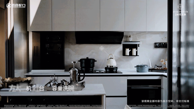 招商时代乐章艺术化的再造传统餐厨空间, 可开可合的岛台设计 ,结合艺术玻璃移门,在提升空间灵动性的同时,也激发出餐厨空间生活的多样性。