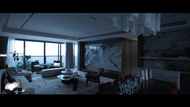 比如,客厅背景墙为定制 水墨山水纹理岩板,将石材纹理与苏州文化多元化结合,高贵雅致,几乎把五星级酒店搬进家。