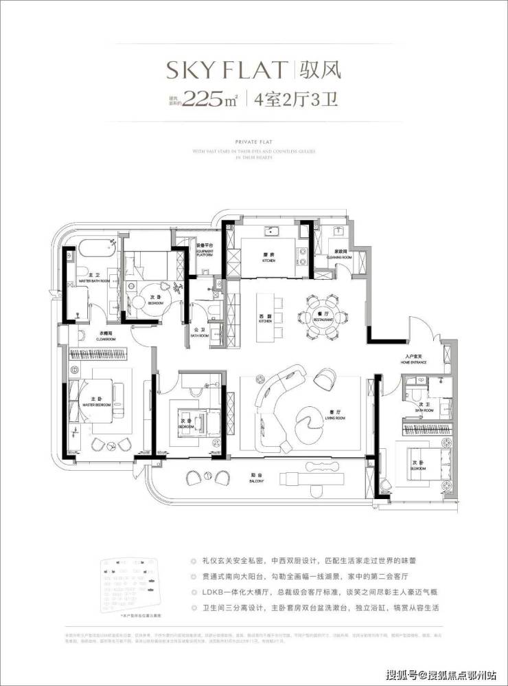 LDKB一体化设计,将总裁级会客厅、阔尺观景餐厅、中西合璧厨房及跑道式大阳台巧妙融合,打造出一个充满互动性与开放性的生活场域 。