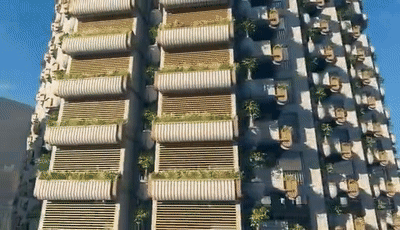 塔楼立面分为上、中、下三段,设计了充分的空中绿化,整体立面呈Artdeco风格 ,南边的塔楼顶部甚至设计了一座 直升机停机坪