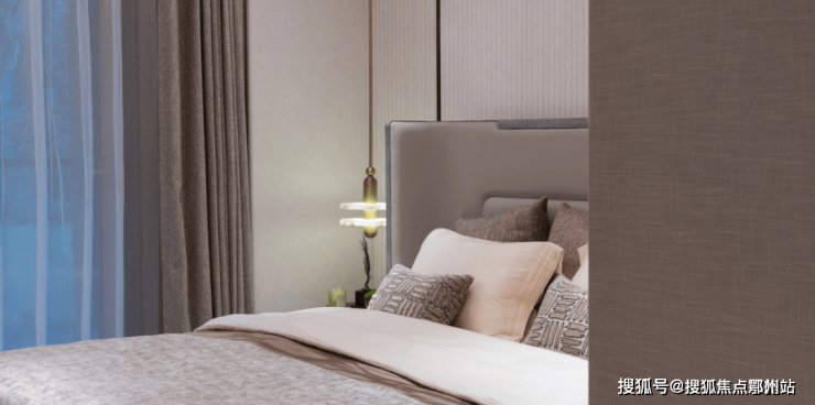 背景、床头柜、枕头、饰物的色调和谐一致,轻逸时尚,有一种把空间“柔软”的氛围,气场又拿捏得恰到好处。